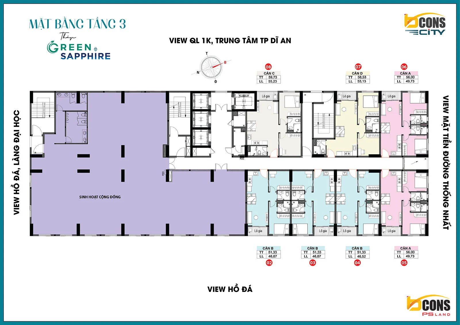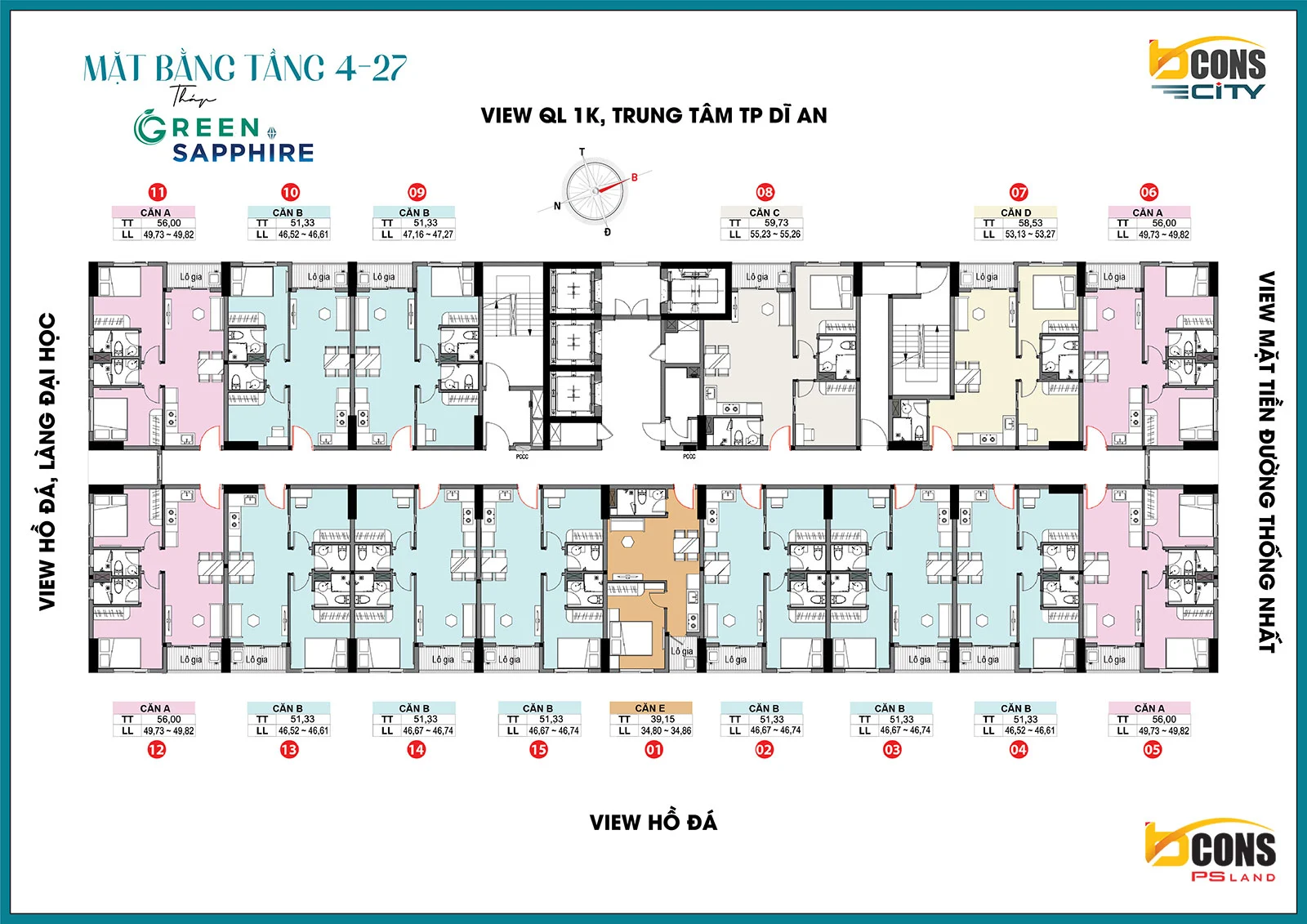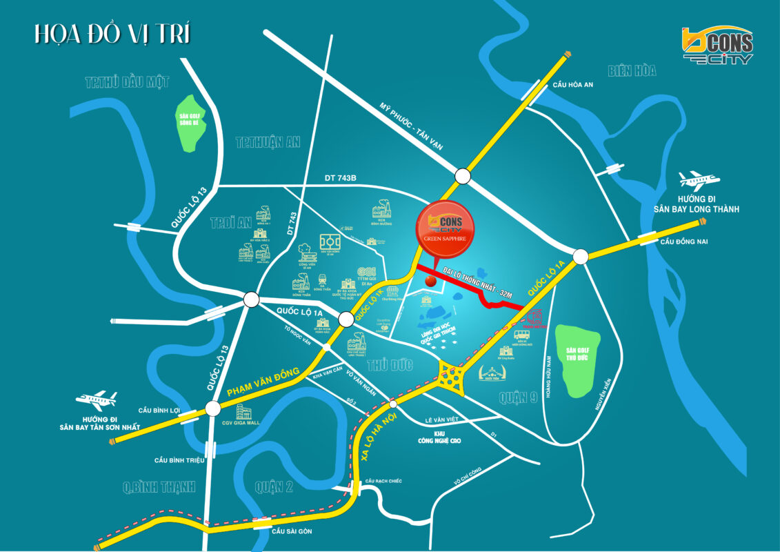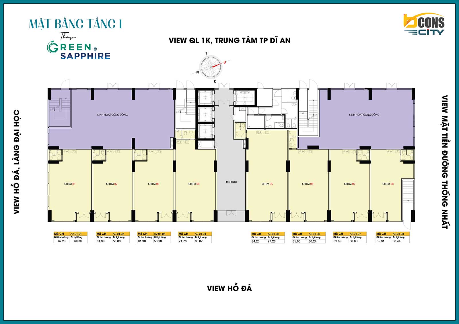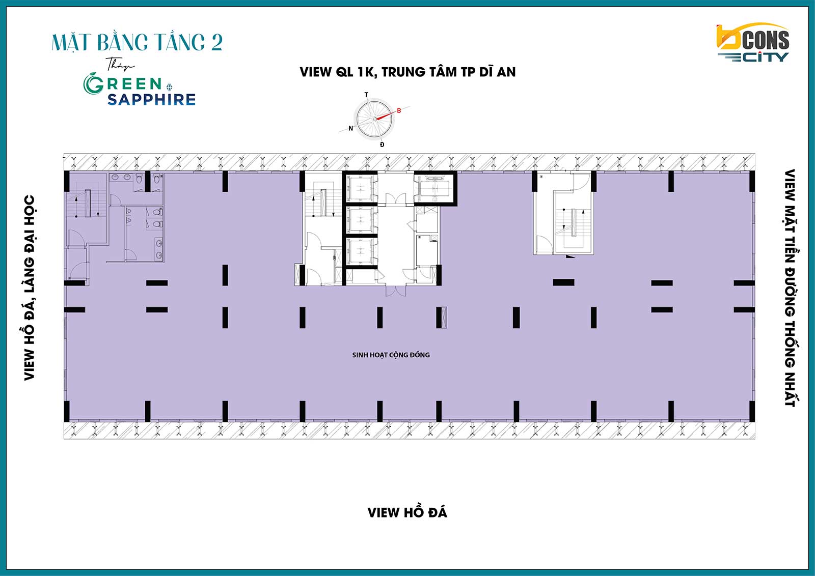 Tháp green sapphire thuộc khu phức hợp Bcons City tọa lạc ngay mặt tiền đường đường Thống Nhất, Đông Hòa, Tp Dĩ An, tỉnh Bình Dương. Dự án thừa hưởng mạng lưới giao thông dày đặc giúp cư dân dễ dàng di chuyển giữa Dĩ An, TP.HCM, Thuận An, Biên Hòa và các thành phố lớn khác trong khu vực. Bcons city – tháp green sapphire là tòa căn hộ thứ 2 dự án với tầm nhìn toàn cảnh không bị các tòa tháp khác che khuất nên 100% view ra Quốc Lộ 1K và Hồ Đá rất đẹp.