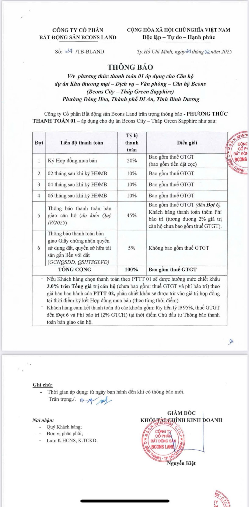 - Phương thức (Tiến độ): chiết khấu 3 – 4% – Khách hàng có thể thanh toán theo tiến độ hoặc vay ngân hàng giải ngân theo từng đợt (trả trước tối thiểu 20% – hỗ trợ vay tới 80%)