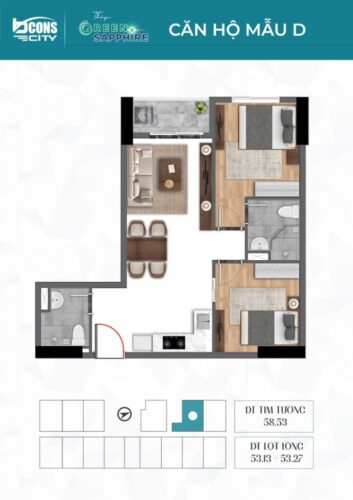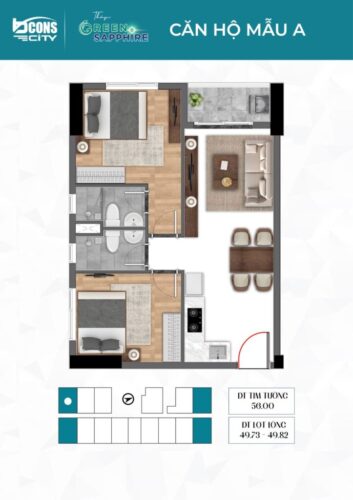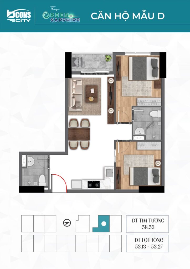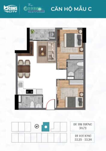 - 52, 56, 58, 60m2: 2 phòng ngủ 2WC